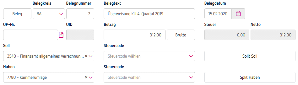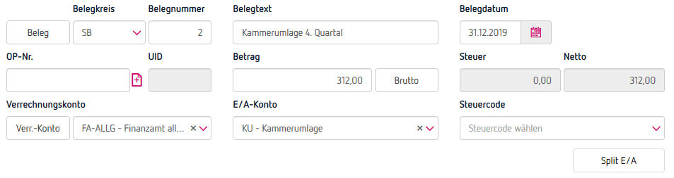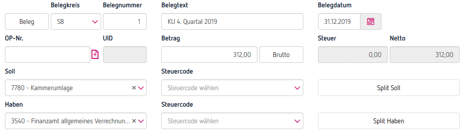 Im Zuge des Jahresabschlusses wird am 31.12.2019 die Kammerumlage des 4. Quartals (1.Okt. bis 31. Dez.) in Höhe von EUR 312,- wie folgt gebucht: