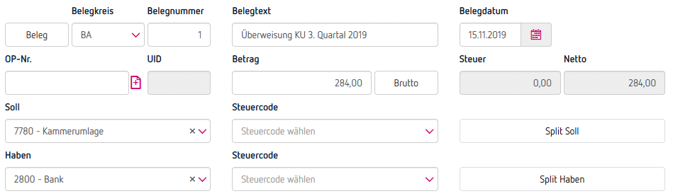 Am 15.11.2019 überweist du die Kammerumlage in Höhe von EUR 284,- für das 3. Quartal 2019.
