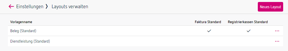 Klicke auf den kleinen Pfeil oberhalb von „Dashboard“ und wähle „Mein Account“ – „Einstellungen“ – „Layout Designer„, um das Aussehen deiner Belege festzulegen. Du kannst zwischen den Vorlagen „Beleg (Standard)“ oder „Dienstleistung (Standard)“ wählen oder ein neues Layout anlegen.