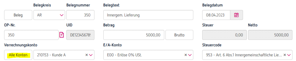 Über die Buchungsmaske erfasst du die offenen Posten wie eine Buchung. Du gibst dabei wie gewohnt Betrag, E/A-Konto, Steuercode, Buchungstext usw. ein, jedoch wird anstatt dem Zahlungskonto das Kunden- oder Lieferantenkonto (in der Bilanz ein Debitor- oder Kreditorkonto) eingetragen.
