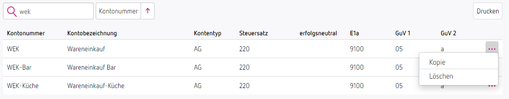 Für das zuvor angeführte Beispiel wird das Konto „WEK“ (Wareneinkauf) kopiert – in der Kopie füllst du dann nur noch die Kontonummer und Kontobezeichnung aus.