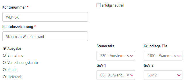 Unbedingt beachtet werden muss dabei, dass du für jede Kennzahl des E 1a (Beilage zur Einkommensteuererklärung, in der die Einnahmen und Ausgaben nach Art angegeben werden müssen) ein eigenes Skonto-Konto verwendest. Es darf z.B. nicht der für Warenlieferungen in Anspruch genommene Skonto im E 1a in der Kennzahl für die übrigen Betriebsausgaben ausgegeben werden.
