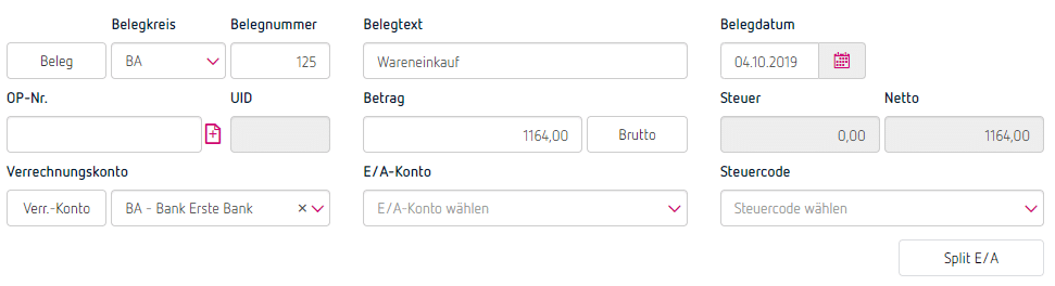 Die Grunddaten der Buchung (Beleg, Datum, Zahlbetrag, Zahlungsmittelkonto) bleiben dabei gleich, lediglich unter „E/A“ erfolgt keine Eingabe. Stattdessen klicke auf „Split E/A“.