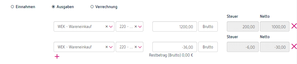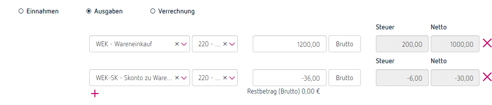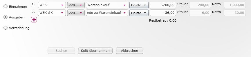 Im Splitbereich wird am eigentlichen Ausgaben-Konto der volle Betrag eingegeben, am Skonto-Konto der Skonto mit Minus vor dem Betrag. Bitte achte unbedingt darauf, dass in der Skonto-Zeile der gleiche Steuercode wie bei der Ausgabenzeile eingegeben wird.