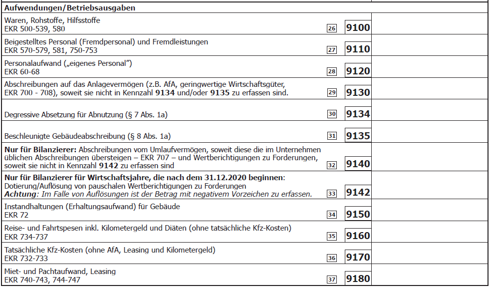 Das Formular E 1a („Beilage zur Einkommensteuererklärung E 1 für Einzelunternehmerinnen/Einzelunternehmer (betriebliche Einkünfte) für 20JJ“) enthält verschiedenste Kennzahlen, in denen jeweils eine spezielle Art von Einnahmen bzw. Ausgaben ausgewiesen werden muss.