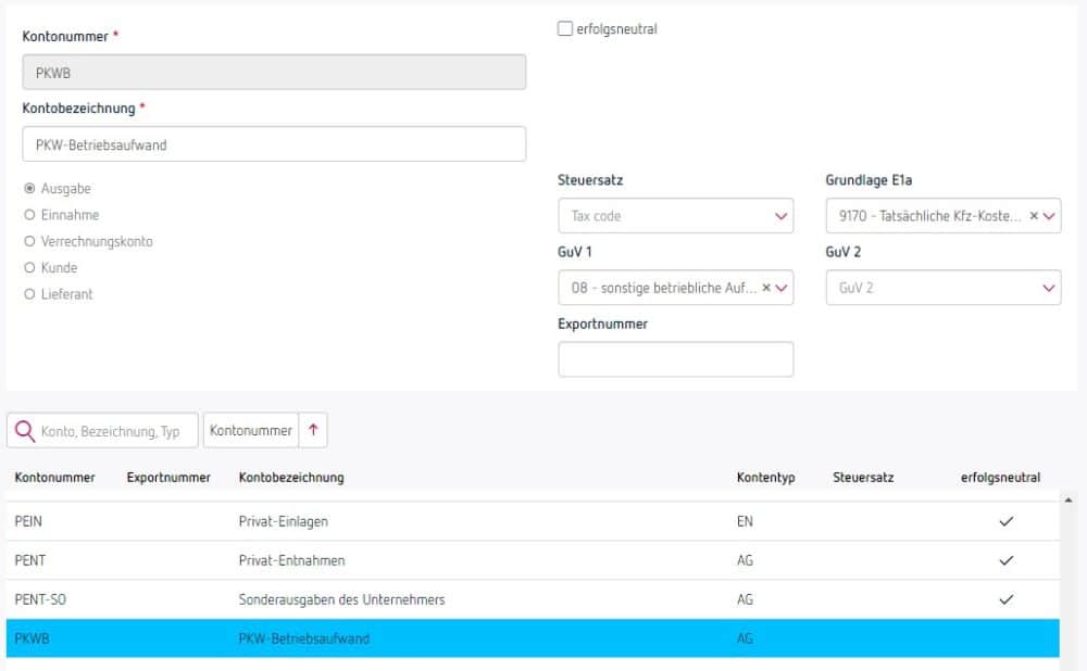 Es empfiehlt sich, im gleichen Arbeitsschritt auch zu prüfen, ob die Einstellung „erfolgsneutral“ auch korrekt gesetzt ist. Erfolgsneutral bedeutet, dass dieses Konto für die Erfolgsrechnung (Ermittlung des steuerlichen Betriebsergebnisses) nicht relevant ist, dazu gehören z.B. der Anlagenankauf, Privatentnahme von Geld, nicht abzugsfähige Bewirtungsspesen (siehe auch Verbuchung von Bewirtungsspesen) u.Ä.