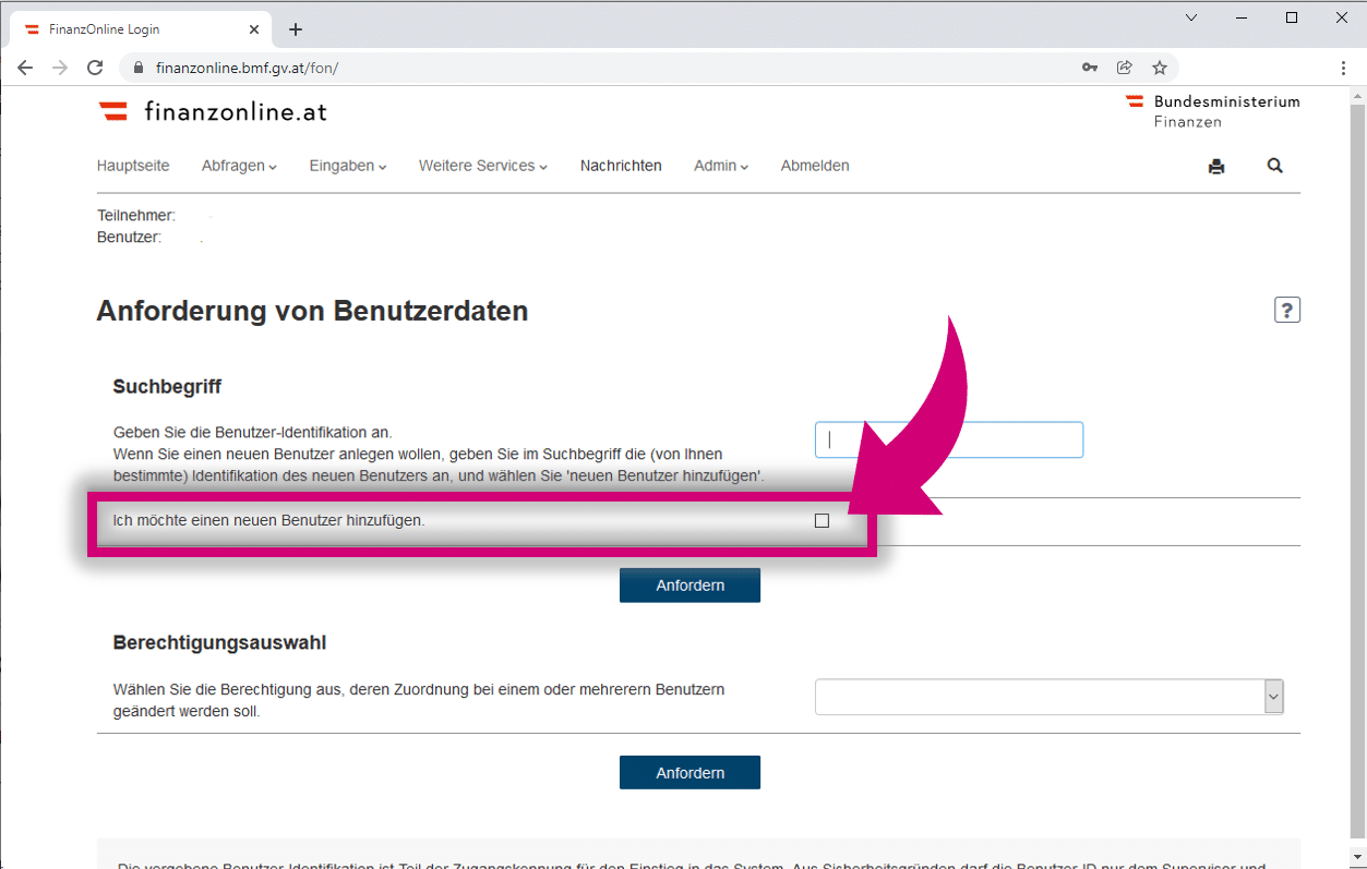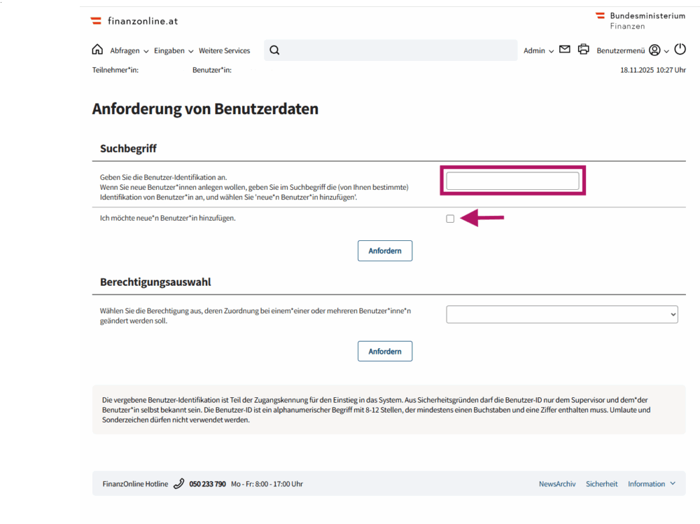 Beachte beim Anlegen von Benutzern bzw. Anwenden von FinanzOnline immer die Hinweise auf der Seite.