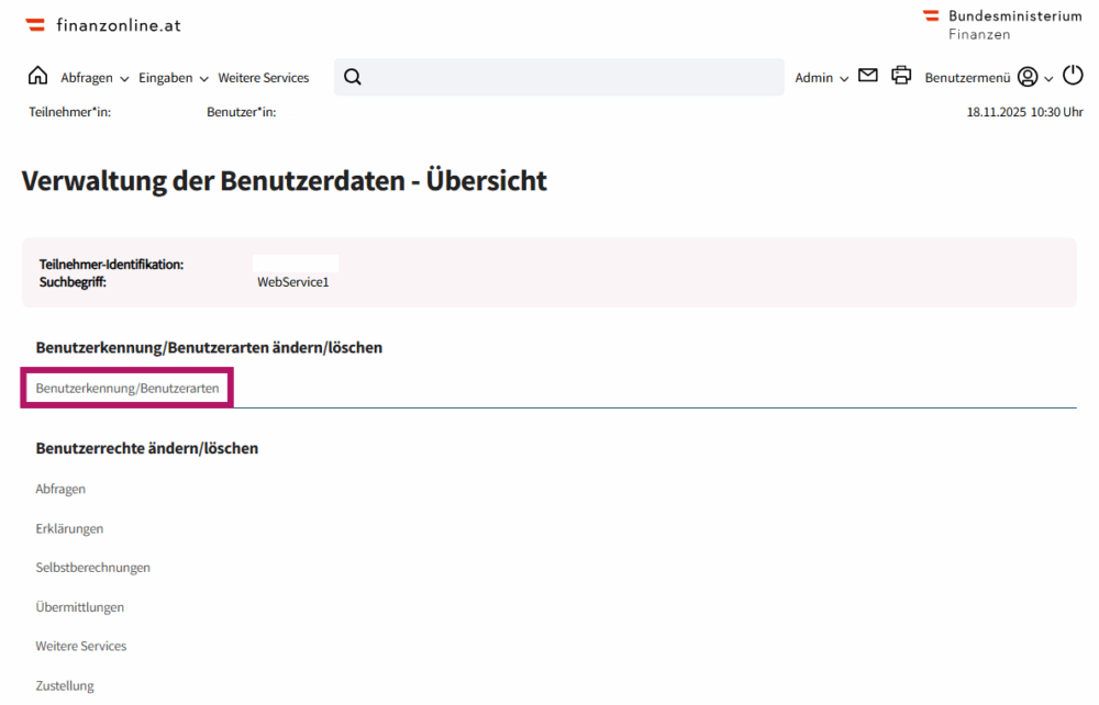 Für die Übermittlungen von Erklärungen mittels WebService an FinanzOnline wird ein eigener, spezieller Benutzer benötigt. Dieser WebService-Benutzer wird zusätzlich zum normalen Benutzer angelegt und wird ausschließlich für die WebService-Übermittlung verwendet. Für alle anderen Funktionen von FinanzOnline wird weiterhin der normale Zugang verwendet.