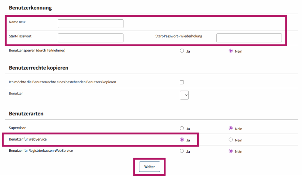 6) Ganz unten bei „Benutzerarten“ aktivierst du die Checkbox „Benutzer für WebService“ und klickst unten auf „Weiter“.