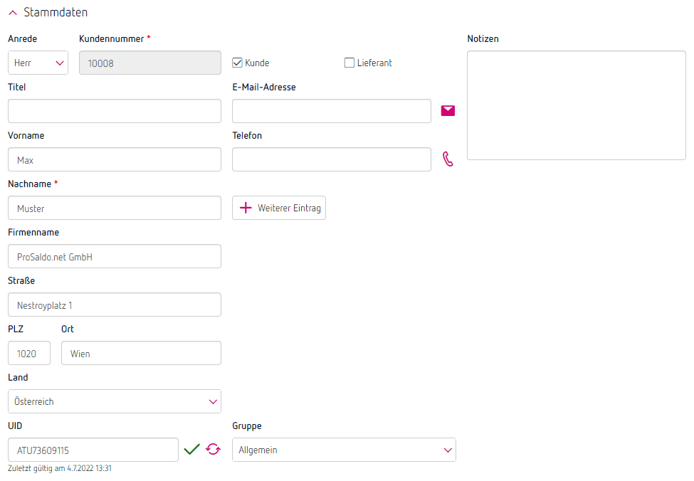 Liegt bei Firmenkunden die UID-Nummer vor, kannst du in ProSaldo.net Name und Adresse deines Kunden direkt übernehmen.