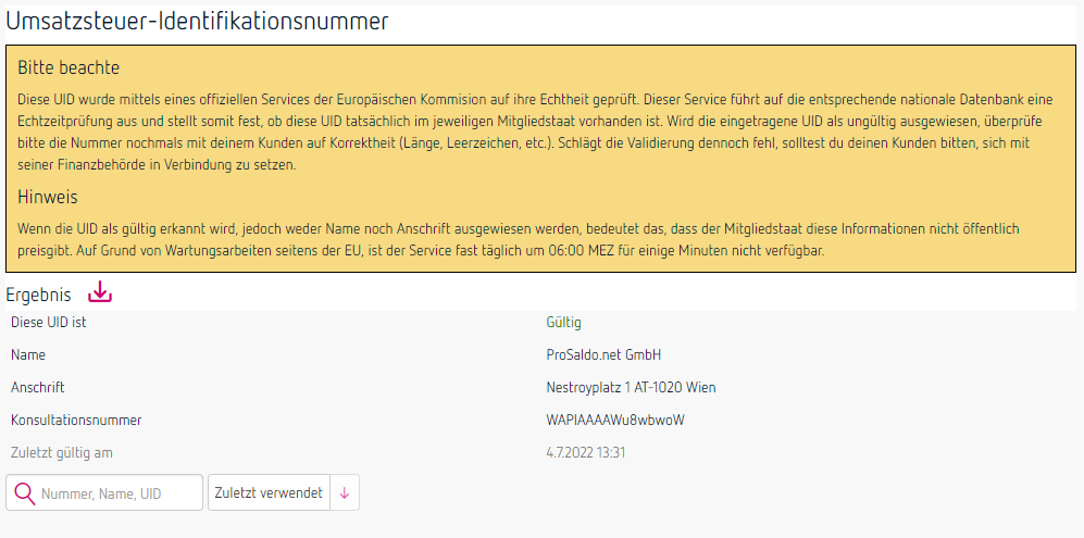 Tipp: Wenn du ProSaldo.net nutzt, kannst du die UID-Prüfung direkt über das Tool erledigen.