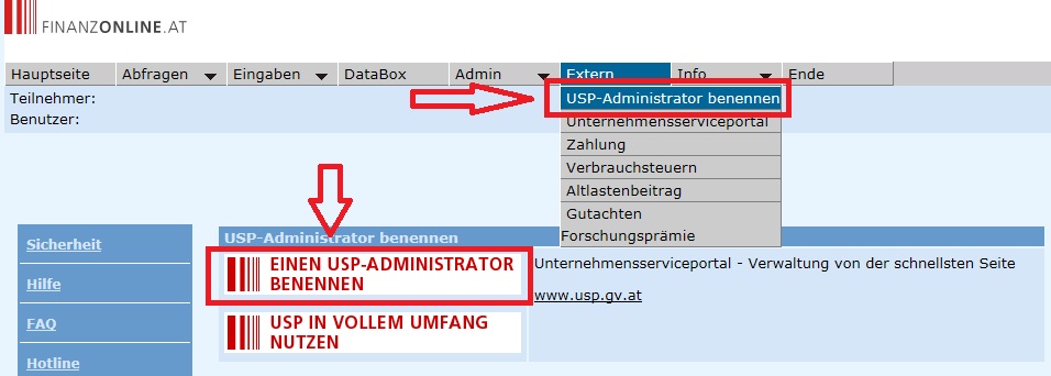In FinanzOnline wählst du das Menü „Extern“ „Unternehmensserviceportal“ oder klickst auf der Hauptseite auf „Einen USP-Administrator benennen“.