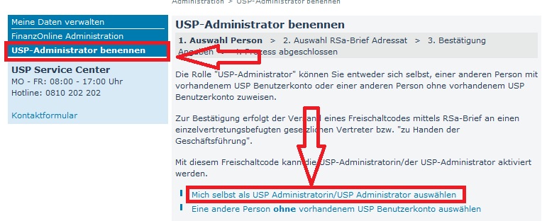 Im nächsten Schritt ist es erforderlich, dass du dich als Administrator für das USP benennst und dies von der Geschäftsleitung bestätigt wird. Dazu wählst du den Menüpunkt „USP-Administrator benennen“.