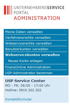 Achtung: Wenn du deinen ersten Webservice-Benutzer angelegt hast, musst du dich am USP ab- und erneut anmelden, damit das Menü „Webservicerechte verwalten“ sichtbar wird!