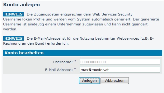 Die Zugangsdaten sind nicht bearbeitbar, sondern werden vom USP fix vorgegeben. Ergänze unter dem angezeigten Benutzernamen deine e-mail Adresse (bzw. die e-mail Adresse des zukünftigen Webservice-Benutzers).